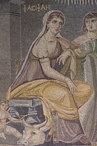 In ancient Greek religion and Greek mythology, Pasiphaë (/pəˈsɪfiiː/; Greek: Πασιφάη, translit. Pasipháē derived from πάσι (archaic dative plural) “for all” and φάος/φῶς phaos/phos “light”) was a queen of Crete, and was often referred to as goddess of witchcraft and sorcery. The daughter of Helios and the Oceanid nymph Perse, Pasiphaë is notable as the mother of the Minotaur. She conceived the Minotaur after mating with the Cretan Bull while hidden within a hollow cow that the Athenian inventor Daedalus built for her, after Poseidon cursed her to fall in love with the bull, due to her husband, Minos, failing to sacrifice the bull to Poseidon as he had promised.